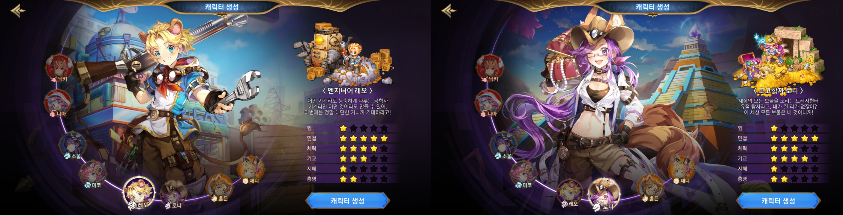 - 엔지니어 레오는 광역 스킬 기반의 원거리 캐릭터이며, 고고학자 로니는 연계 스킬 기반의 원거리 캐릭터입니다.
