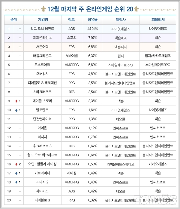 12월 마지막주 온라인 게임 순위를 안내해드립니다.