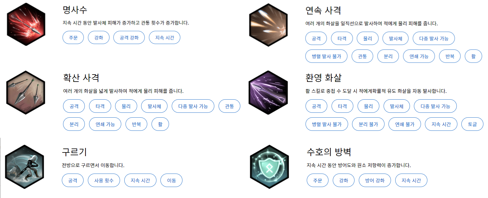 명사수 - 확산사격 - 연속사격 - 환영 화살 - 구르기 - 수호의 방벽 빌드를 추천합니다.