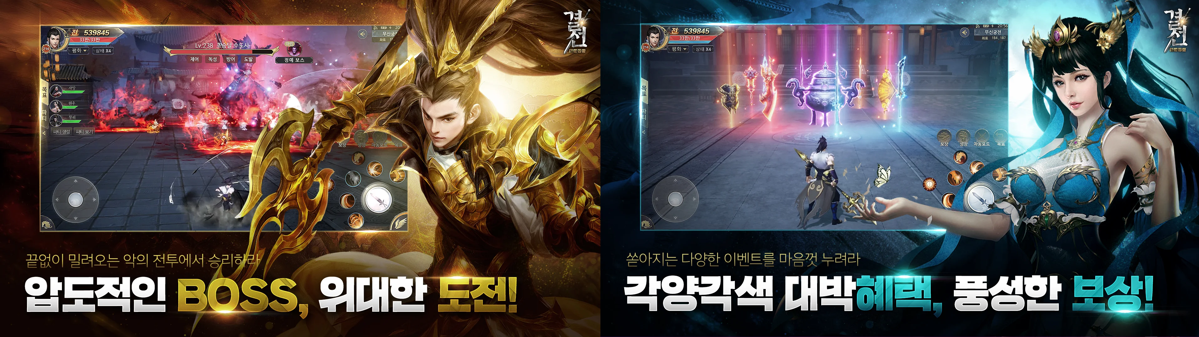 - 서버대전, 문파전, 국가전 등 박진감 넘치는 전장.