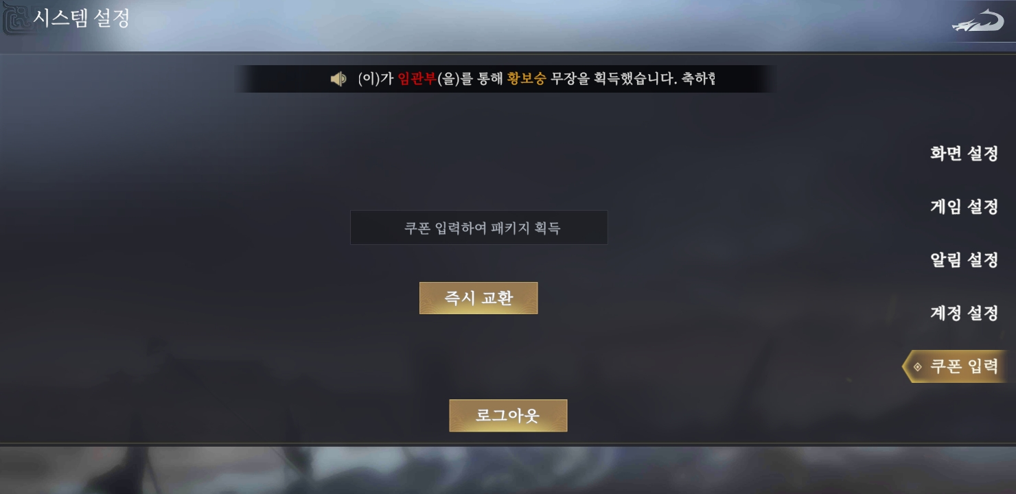4. 삼국지 패왕 쿠폰번호를 입력 후 즉시 교환을 터치하면 완료됩니다.