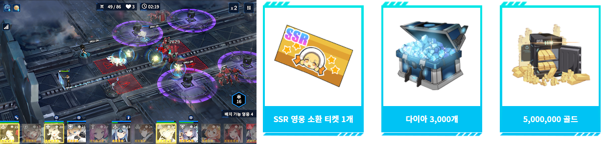 타임디펜더스 사전예약 보상 : SSR영웅 소환 티켓 1개, 다이아 3,000개, 500만골드.