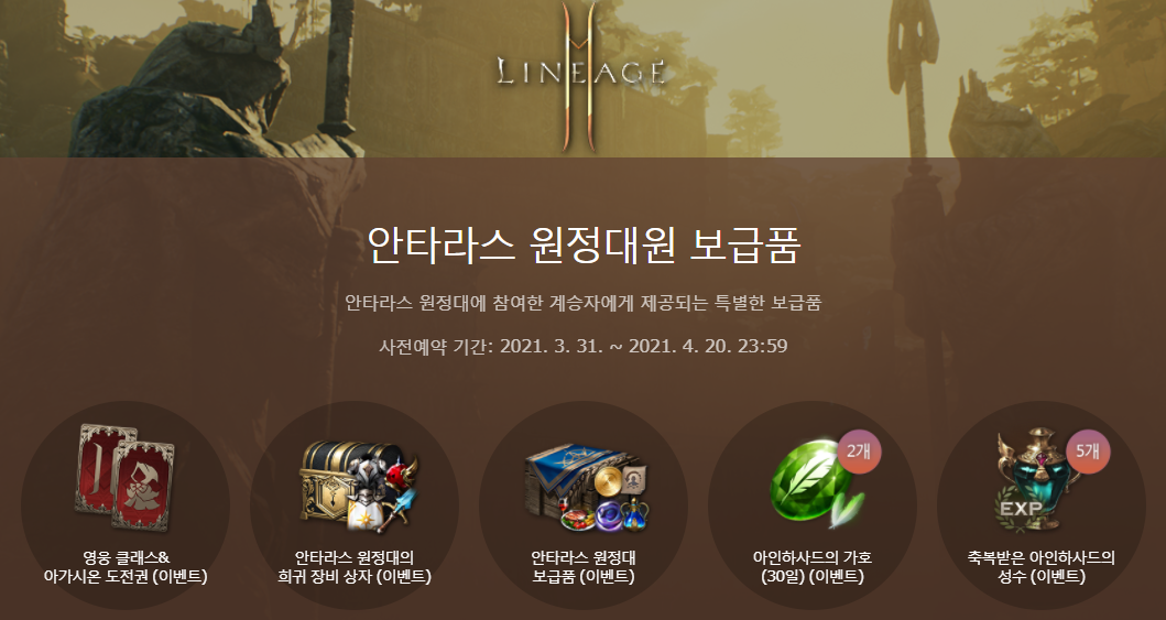 보상 : 안타라스 원정대 보급품 세트(정령탄 및 성장 소모품 등의 보급품 지원 상자), 영웅클래스/아가시온 도전권, 안타라스 원정대 희귀 장비 상자, 아인하사의 가호 (30일) 2개, 축복받은 아인하사드의 성수 5개.